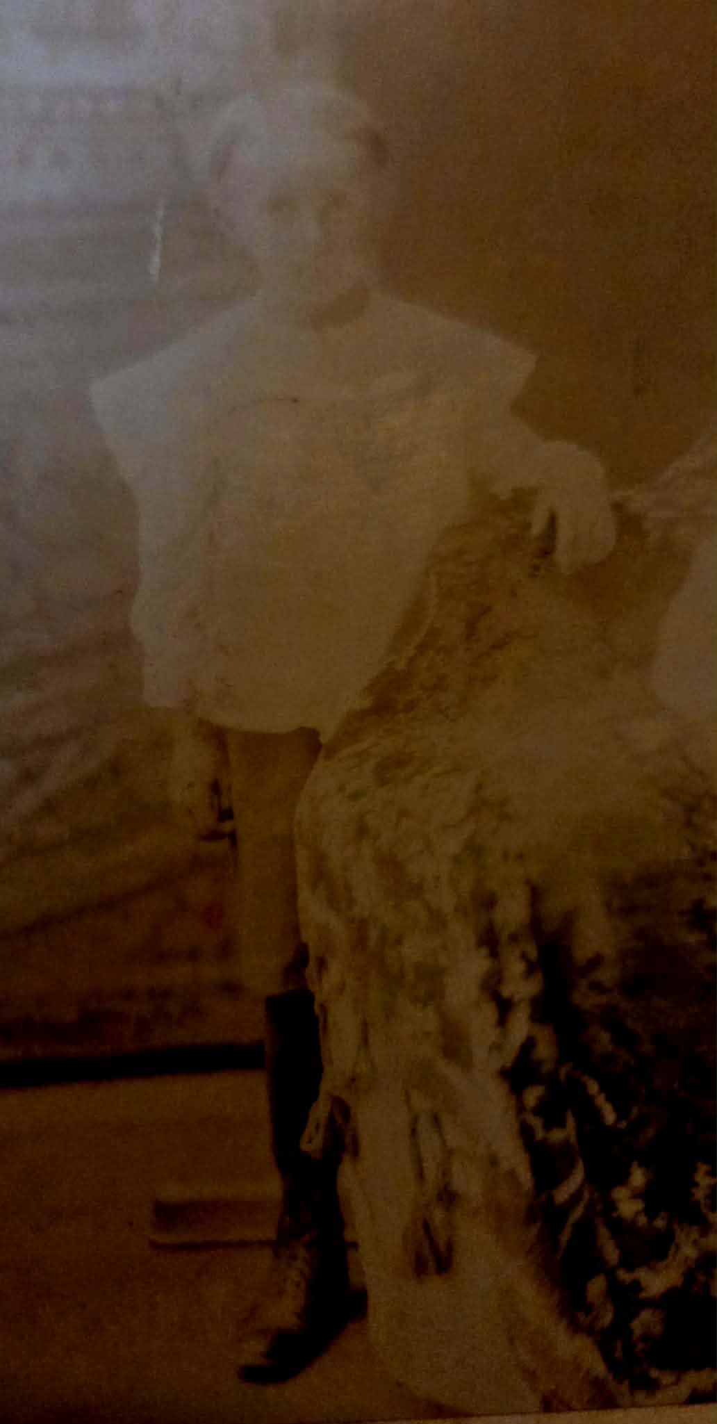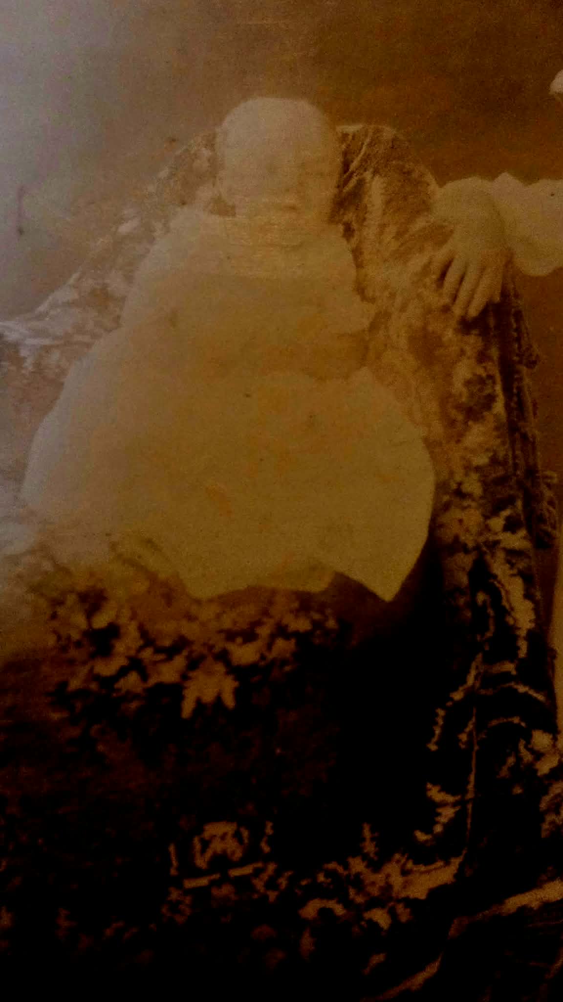 Photograph is very aged and faded with a lovely tapestry covering a baby buggy.