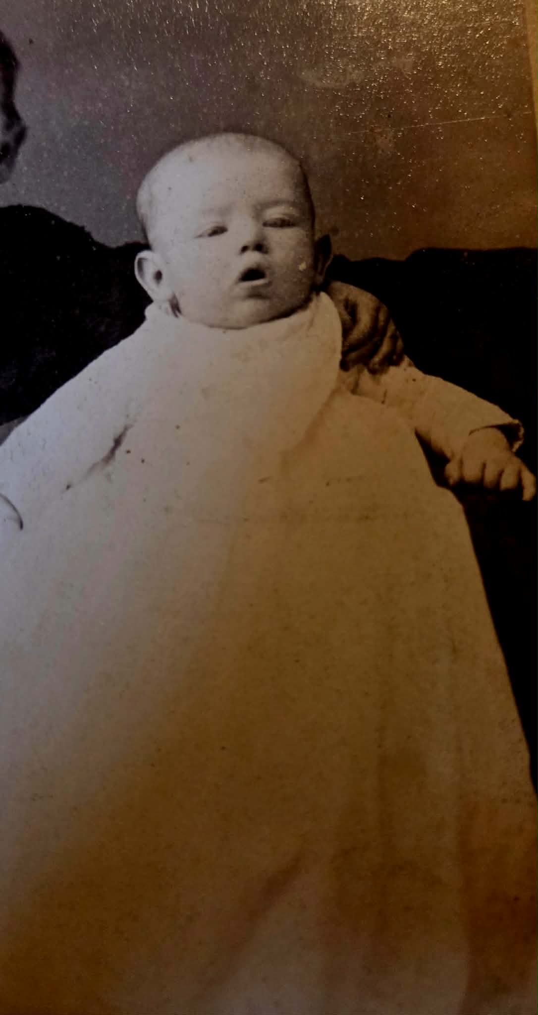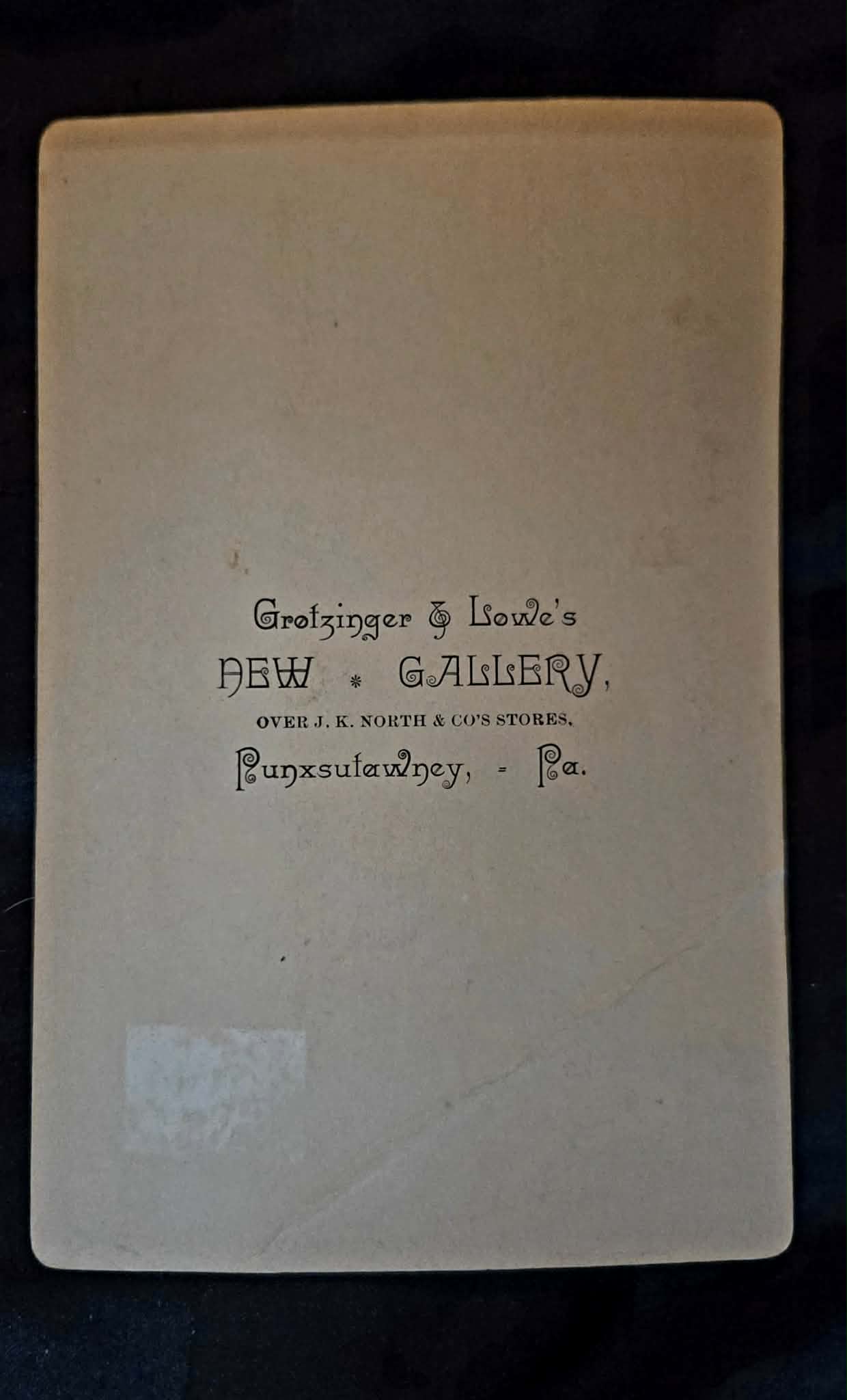 Photograph is "framed" in gold foiling with an emblem from Grotzinger Photography of Gilpin Street, Punxatawny, PA.